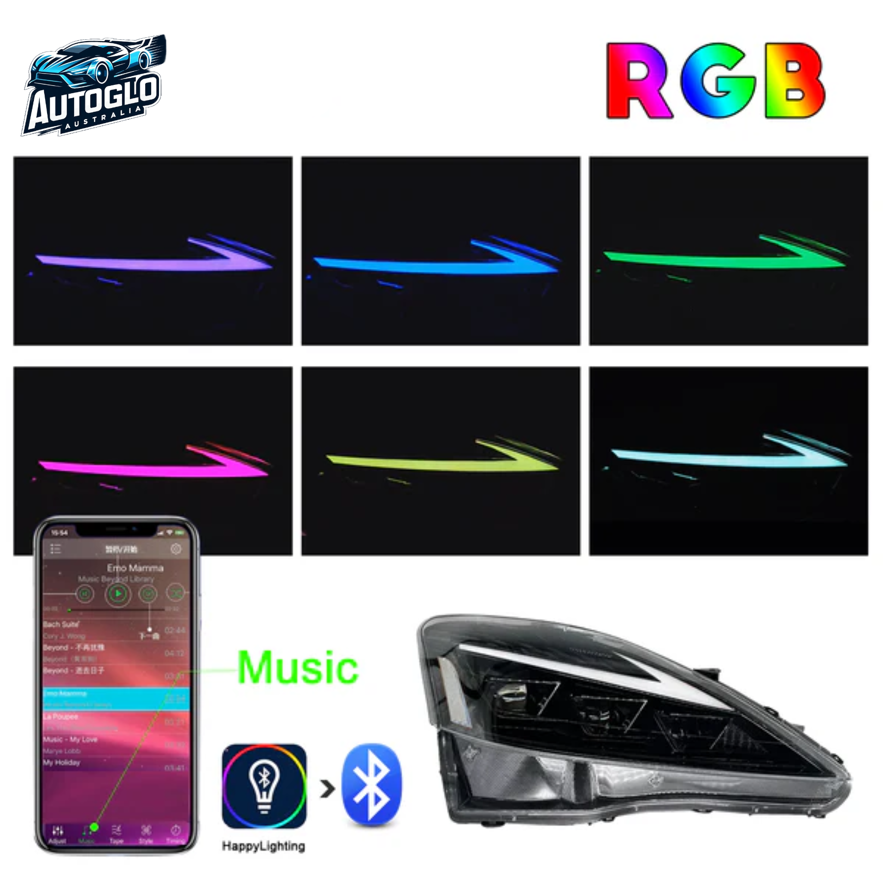 Autoglo Australia RGB LED Headlights for Lexus IS250 / IS350C / ISF (2006–2013) – RGB Color Effects | Start-Up Animation | High Brightness LED Technology