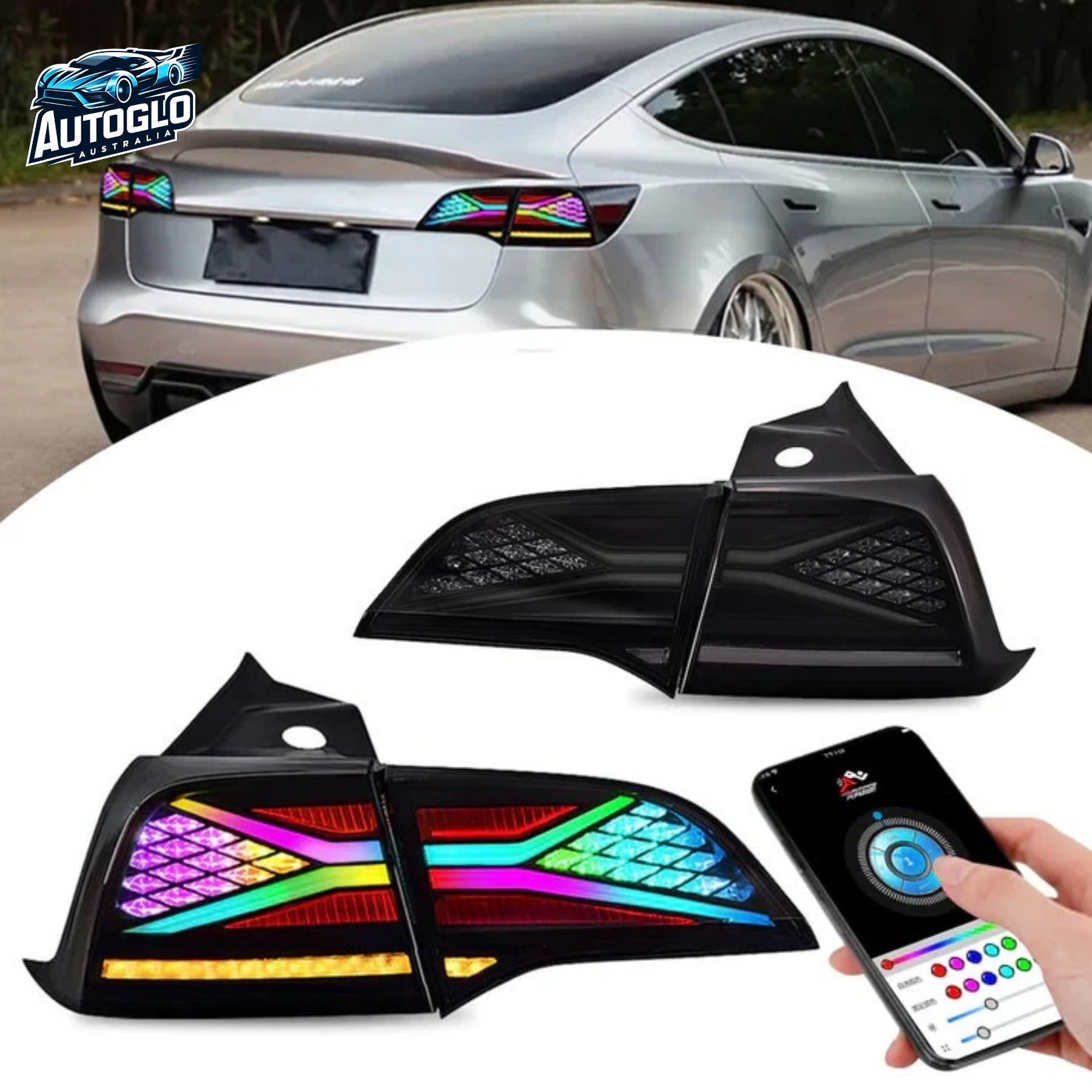 Autoglo Australia RGB LED Tail Lights For Tesla Model 3 / Model Y – Sequential Turn Signals, App-Controlled Color Customization, Plug & Play