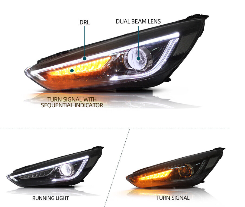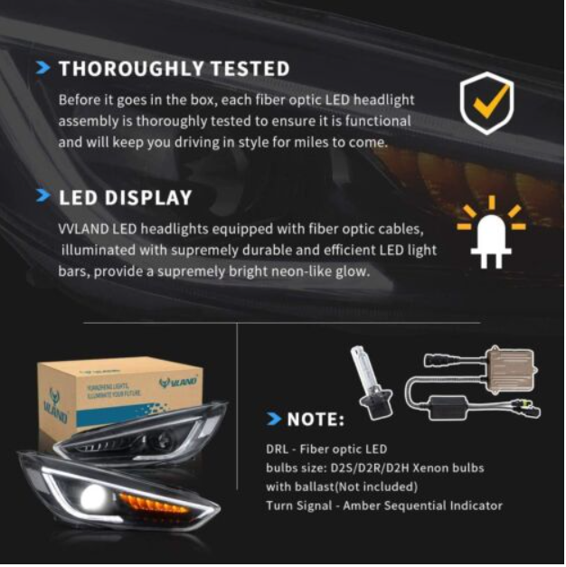 Enhance your Ford Focus with these premium VLAND LED projector headlights. Featuring sleek black housing and crisp LED sequential turn signals, they provide superior illumination and a modern, aggressive look. Perfect for drivers seeking both style and improved night-time visibility.