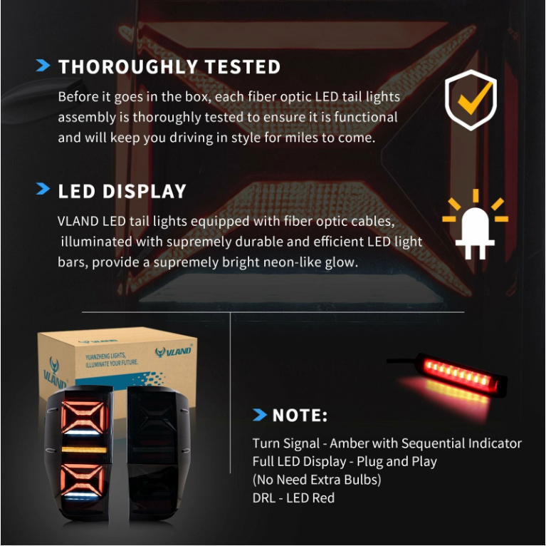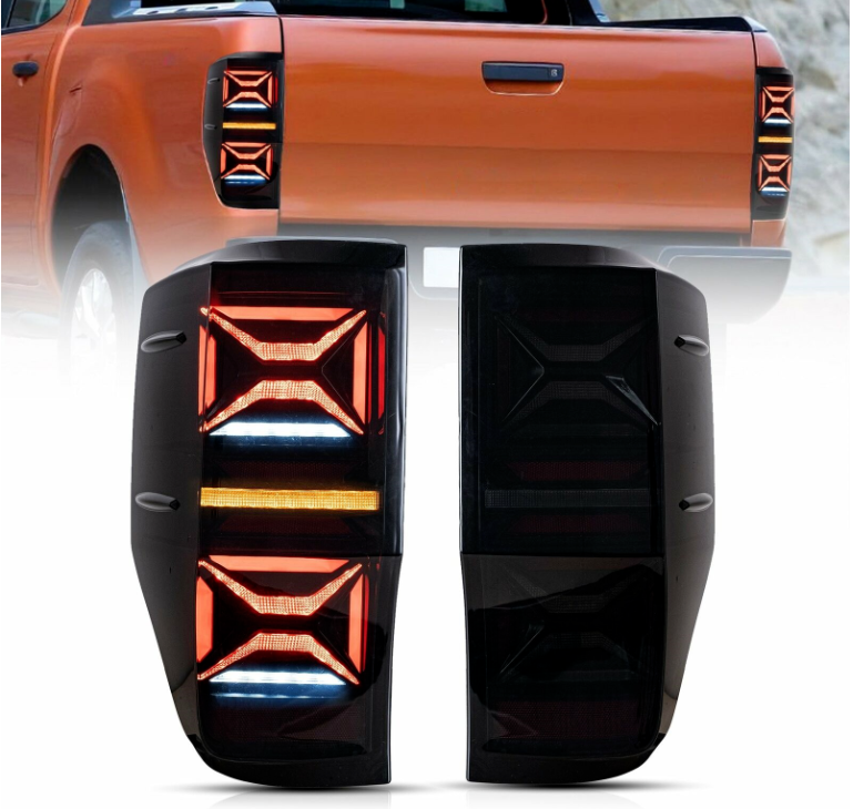 Upgrade your Ford Ranger T6 with these VLAND Full LED Tail Lights featuring sequential turn signals. These lights are plug-and-play, fitting perfectly with OEM specifications and DOT-certified for road use. The black housing and smoked lens add a sleek look to your vehicle while the LED bulbs provide bright and reliable lighting. The package includes a pair of tail lights with LED running lights, brake lights, and reverse lights. The turn signals feature amber LEDs with sequential indicators for added safety. With a 1-year manufacturer warranty and fast shipping, these tail lights are the perfect direct replacement for your Ford Ranger T6.