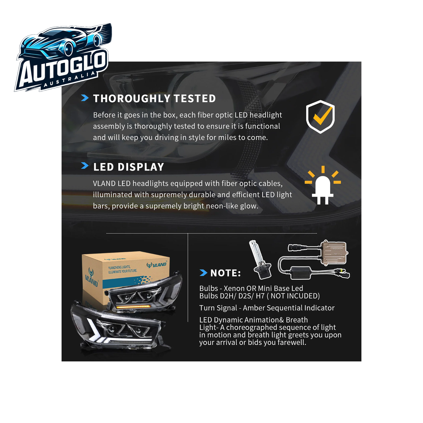Upgrade the front end of your Toyota Hilux with these VLAND Full LED Headlights. Featuring sequential turn signals and diamond white LED lighting, these headlights offer a sharp, modern aesthetic while dramatically improving visibility and road safety. Built with high-quality materials and sealed for durability, these headlights are the perfect combination of form and function.