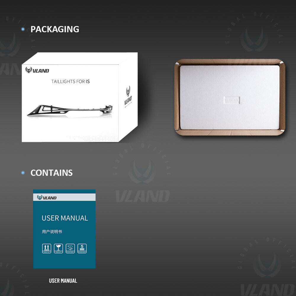 Product Description: Upgrade your Lexus IS250, 300h, or 350 F (2014-2020) with VLAND LED taillights from Autoglo Australia. Designed for enhanced visibility and safety, these taillights feature full LED technology, eliminating the need for bulbs. The package includes one pair of taillights, each with the same connections and wiring as the original taillights, ensuring an easy installation process. However, professional installation is recommended for the best results.